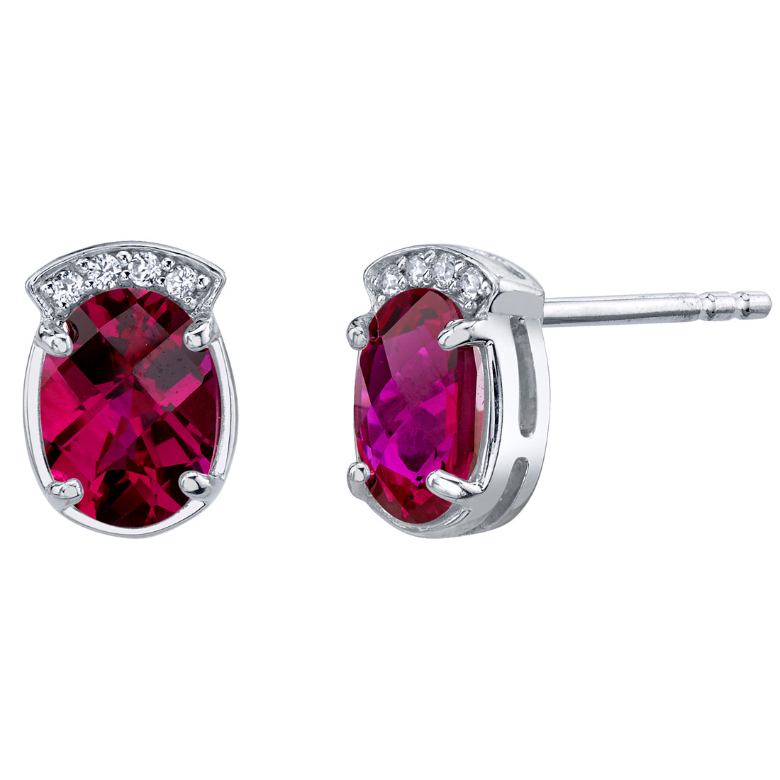 The perfect size for showing off exquisite beauty, these stud earrings bask in a timeless look. A series of Cubic Zirconia accents line the top of the oval created Ruby for added shimmer. A raised profile brings out the loveliness of highly polished Sterling Silver. Attractively boxed for easy gift giving.