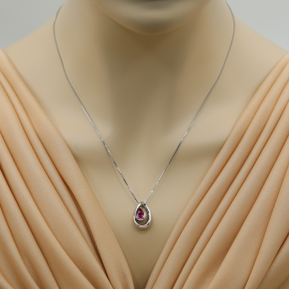 A continuous swirl of shiny Sterling Silver envelops a pear-shaped created Ruby, making this pendant necklace a knock out! Quickly drawing the eye to the deep red center are impeccably cut-by-hand polished facets for a rich textural finish. Includes a box for easy gift giving.