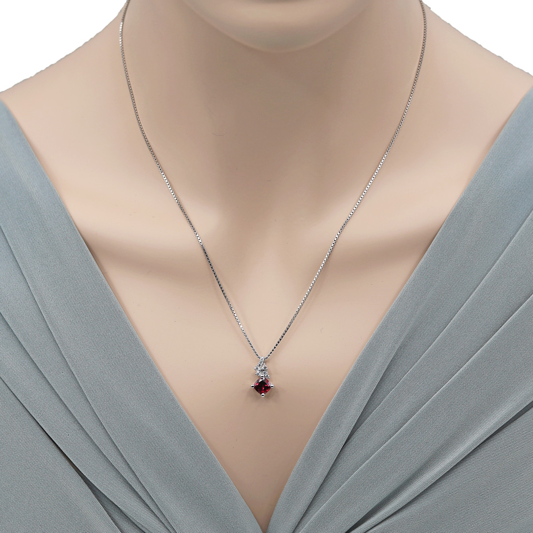 This pendant necklace keeps it classy. Crafted from a cushion-cut genuine Garnet gemstone set on the axis, itÂ’s designed for maximum visibility. A four-prong setting lets the beauty of bold red shine through while holding the stone securely in place. Dazzling Cubic Zirconia accents adorn the bail to offer plenty of texture. Only ethically sourced, conflict-free genuine gemstones are used. Includes a box for easy gift giving.
